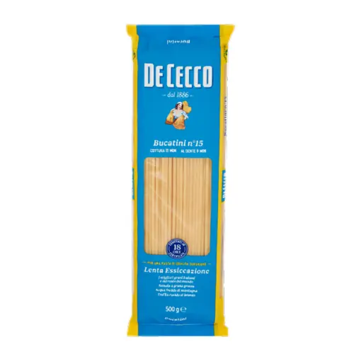 I Bucatini n.15 De Cecco sono una pasta di semola di grano duro ottenuta da grani selezionati italiani e internazionali. La lenta essiccazione preserva gusto, consistenza e qualità della materia prima, garantendo una cottura uniforme e una tenuta ottimale. Ideali per sughi ricchi e tradizionali, rappresentano un classico della cucina italiana.