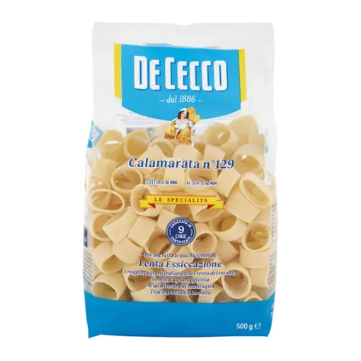 La Calamarata n.129 De Cecco è una pasta di semola di grano duro lavorata secondo tradizione, con lenta essiccazione che assicura una perfetta tenuta in cottura e una consistenza corposa. Ideale per primi piatti ricchi e preparazioni di mare. Prodotta con grani selezionati e attenzione artigianale.