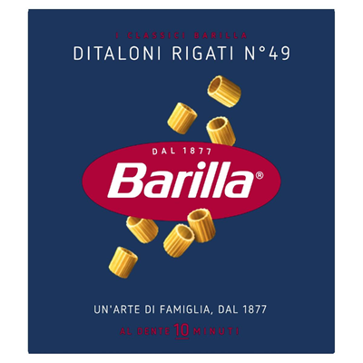 I Ditaloni Rigati n°49 Barilla sono un formato di pasta corto e robusto, caratterizzato da un diametro più ampio e da rigature esterne che permettono di trattenere perfettamente il condimento. La loro forma cilindrica e cava consente al sugo di distribuirsi sia all’interno che all’esterno, garantendo un risultato ricco e avvolgente.