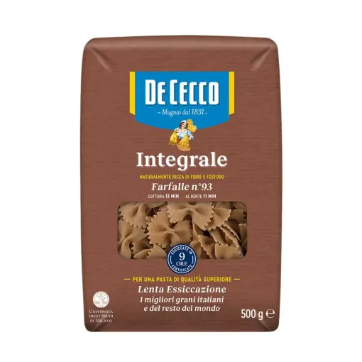 Pasta integrale di grano duro 100% De Cecco, trafilata al bronzo e a lenta essiccazione. Ideale con sughi delicati, salse bianche, verdure e piatti freddi.