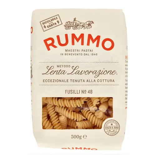 Fusilli Rummo n°48 di semola di grano duro, formato corto e avvolgente con eccezionale tenuta alla cottura.