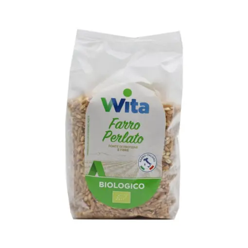 Farro perlato biologico, fonte naturale di fibre e proteine, ideale per zuppe, insalate e piatti caldi.