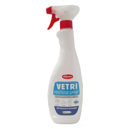 Spray detergente multiuso per vetri e superfici verticali, pulisce senza lasciare aloni e non necessita di risciacquo.