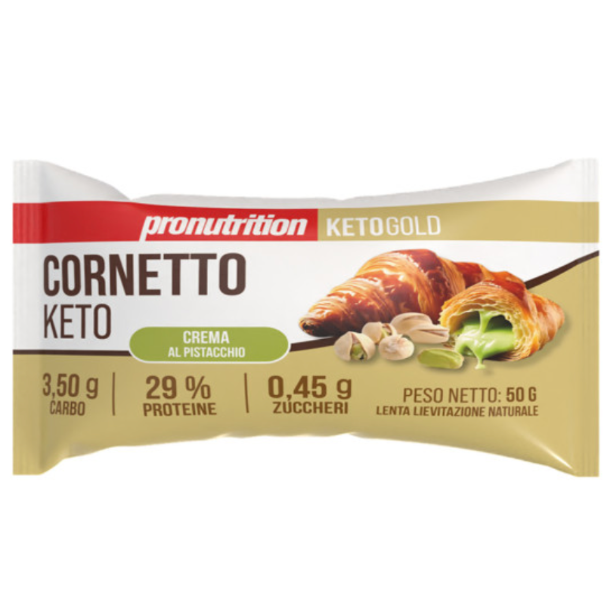 Il Cornetto Keto Crema al Pistacchio ProNutrition KetoGold è uno snack proteico pensato per chi desidera concedersi una pausa dolce mantenendo un regime alimentare controllato. Grazie alla sua formulazione specifica per diete low carb e chetogeniche, offre un equilibrio nutrizionale ideale per chi vuole limitare l’assunzione di carboidrati senza rinunciare al gusto.