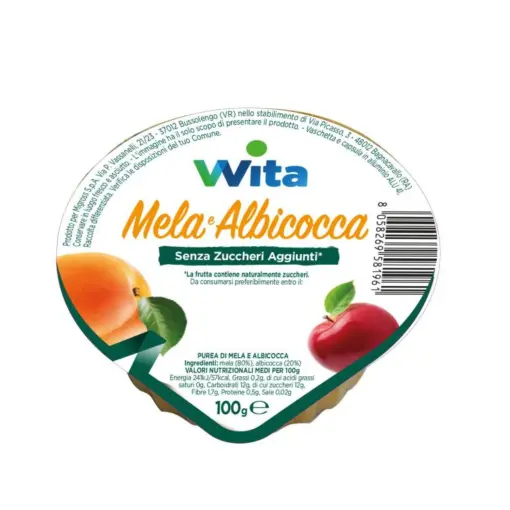 Purea di mela e albicocca Wita senza zuccheri aggiunti, realizzata solo con frutta selezionata, ideale per una pausa sana e naturale.