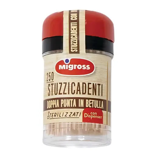 Stuzzicadenti Migross in legno di betulla, sterilizzati, a doppia punta, pratici e igienici grazie al dispenser richiudibile.